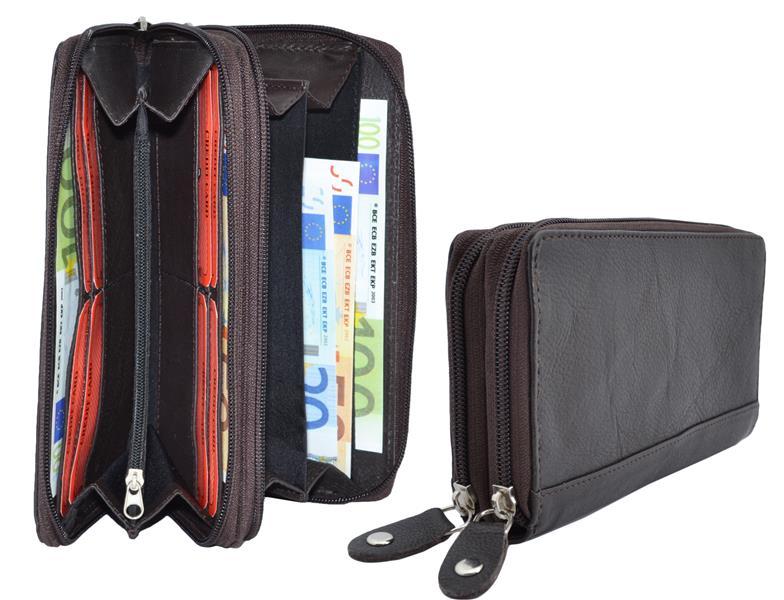 Impex Große Damenbörse 2 Reißverschlüsse rundum Vollrind Leder dunkelbraun
